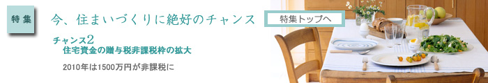 両親などから住宅資金に住宅取得資金の贈与を受けた場合、2010年は1,500万円、2011年は1,000万円が非課税となりました。相続時精算課税制度では、2,500万円までが非課税となるため、住宅取得資金が最大で2010年が4,000万円、2011年が3,500万円まで非課税となります。住宅資金の贈与税非課税枠がなかった場合を最低税率の10%で考えても、150万円〜100万円が軽減されることになります。
